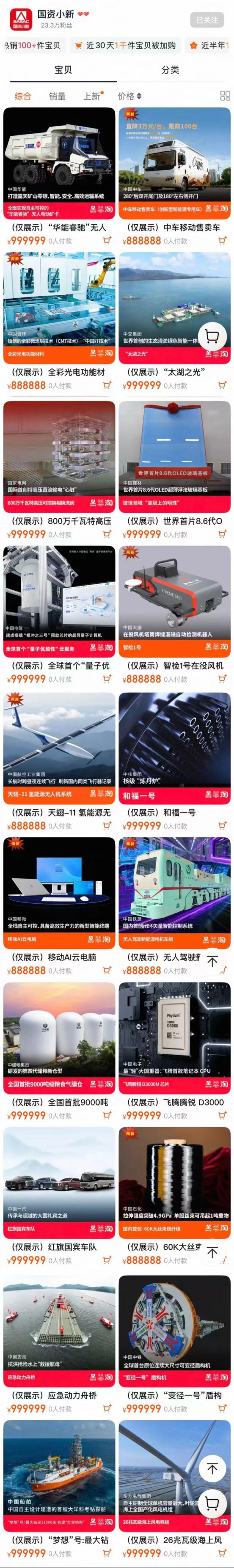 细心的朋友们可能已经发现,今年“国资小新”淘宝店铺上新的诸多大国重器中,既有标价999999的尖端“硬货”、“无价之宝”,寓意自立自强的底气;